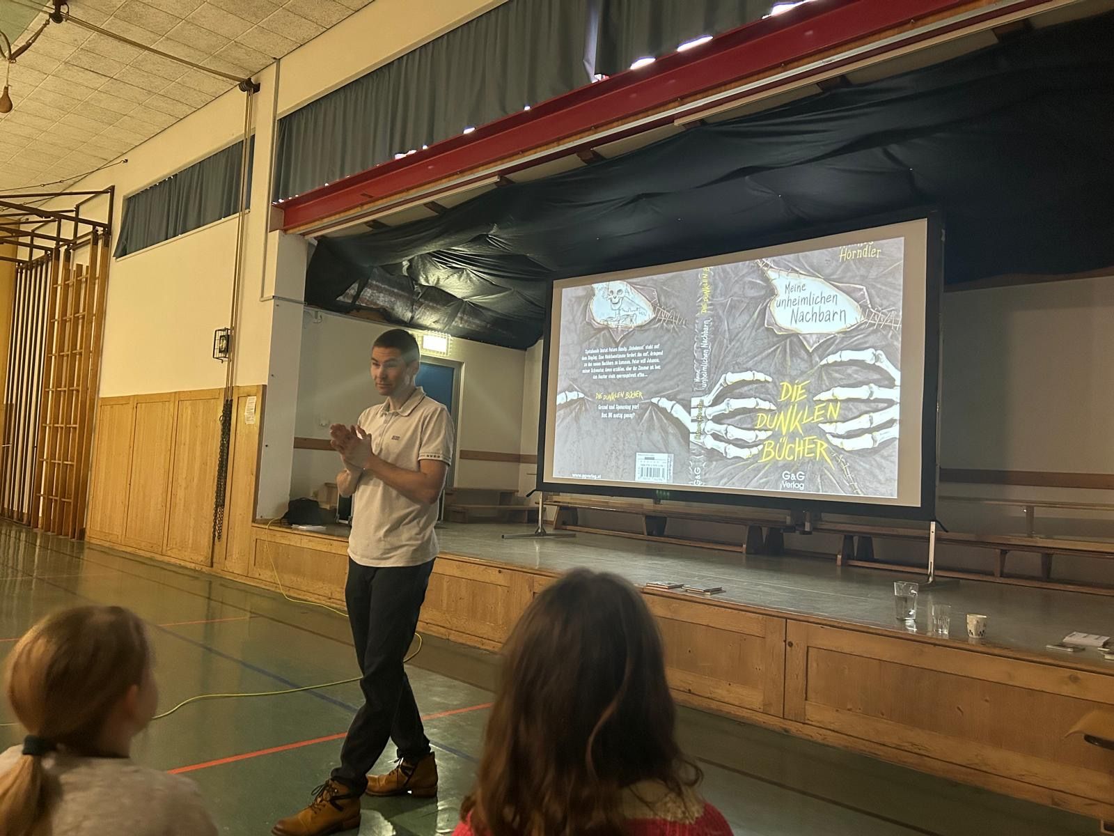 Am ersten Tag nach den Weihnachtsferien wurde den Schülern und Schülerinnen der Volksschule und der Mittelschule Stein an der Enns ein echtes Highlight geboten, und zwar eine Lesung mit Hannes Hörndler. Im Turnsaal begeisterte der erfolgreiche Kinder- und Jugendbuchautor jeweils eine Schulstunde lang zuerst die dritte und vierte Klasse der Volksschule sowie die ersten Klassen der Mittelschule und anschließend die Jahrgänge zwei bis vier unserer Schule.