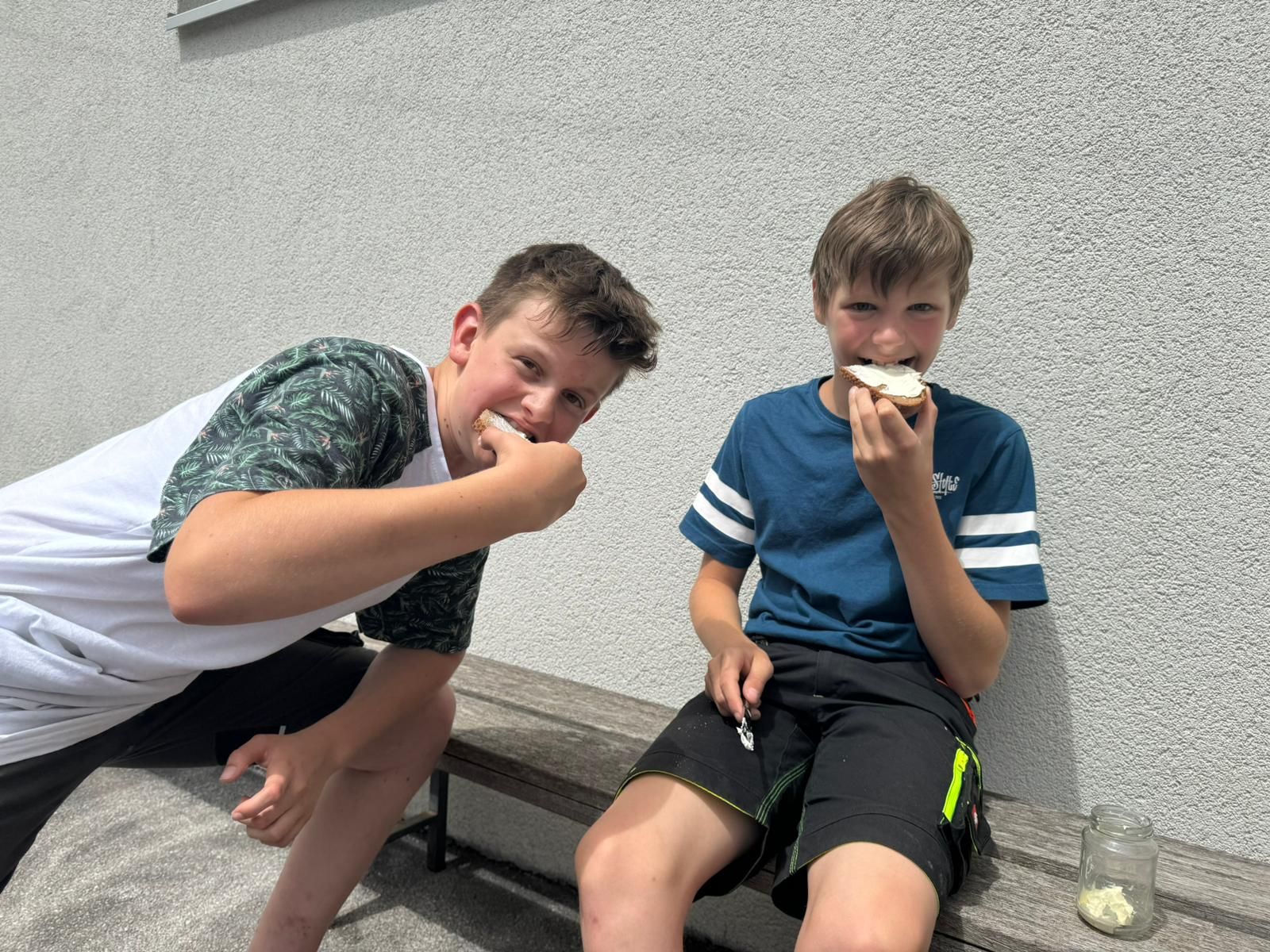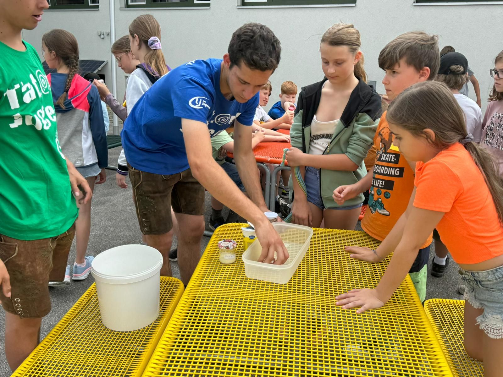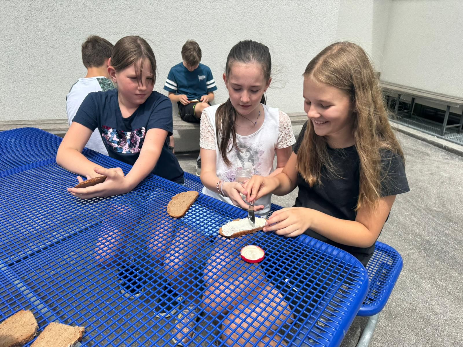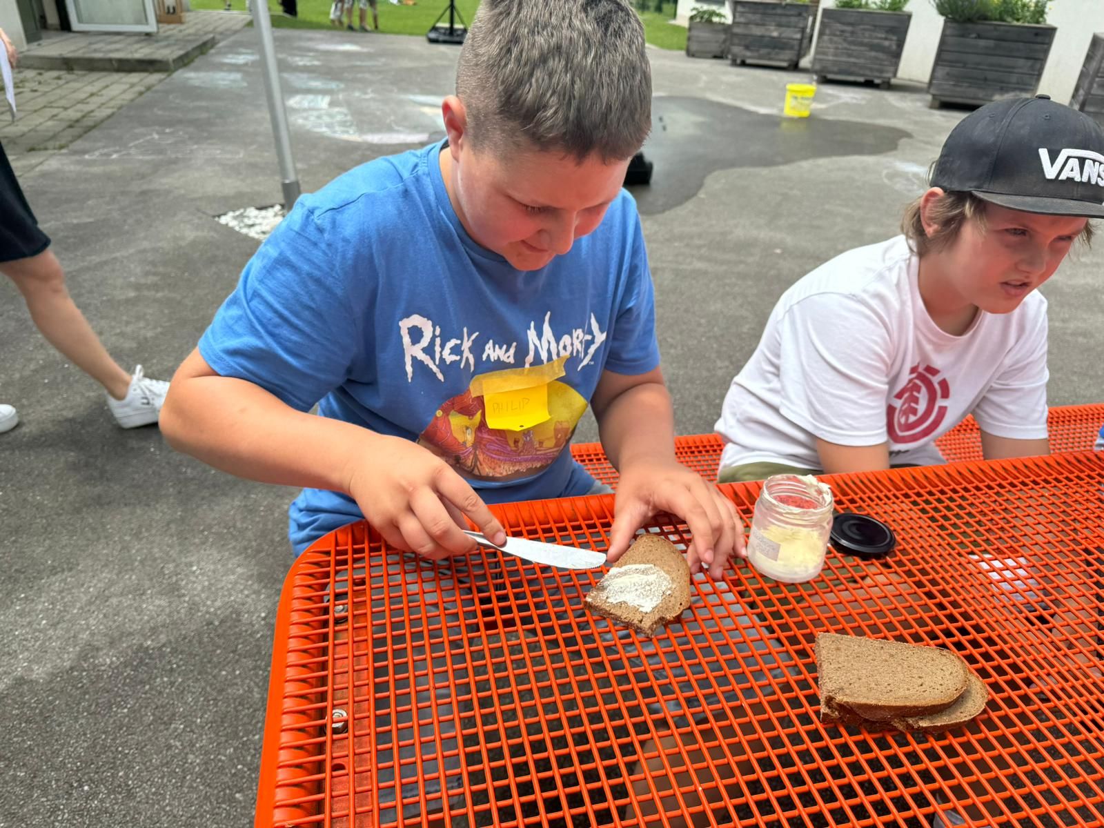 Anschließend ging es auf den Schulhof zum „praktischen“ Teil. Die Erstklässler wurden in zwei Gruppen aufgeteilt und durften sich beispielsweise an einem Melkdummy versuchen oder Butter machen, die auf Brot sodann auch verkostet werden konnte.
