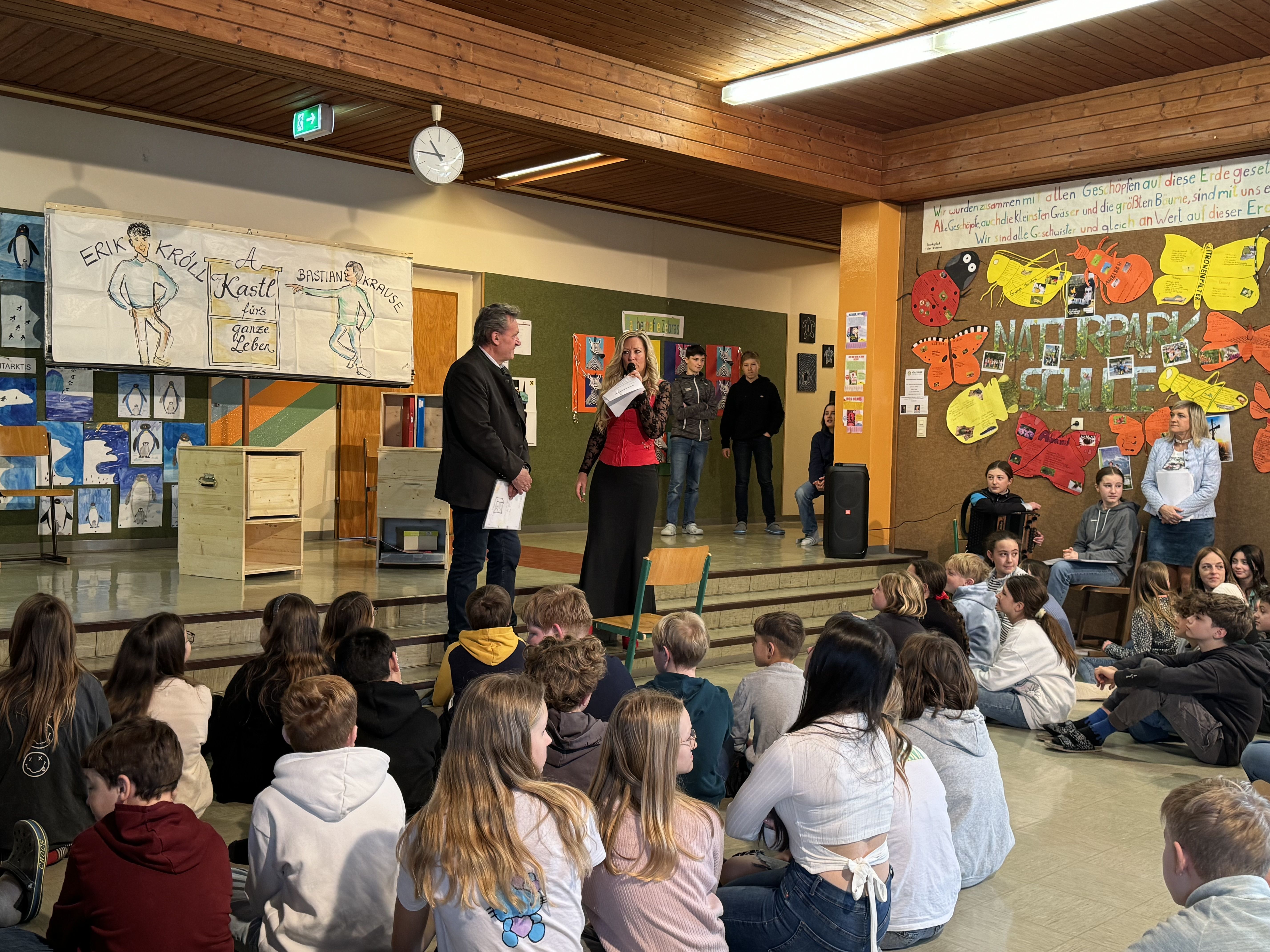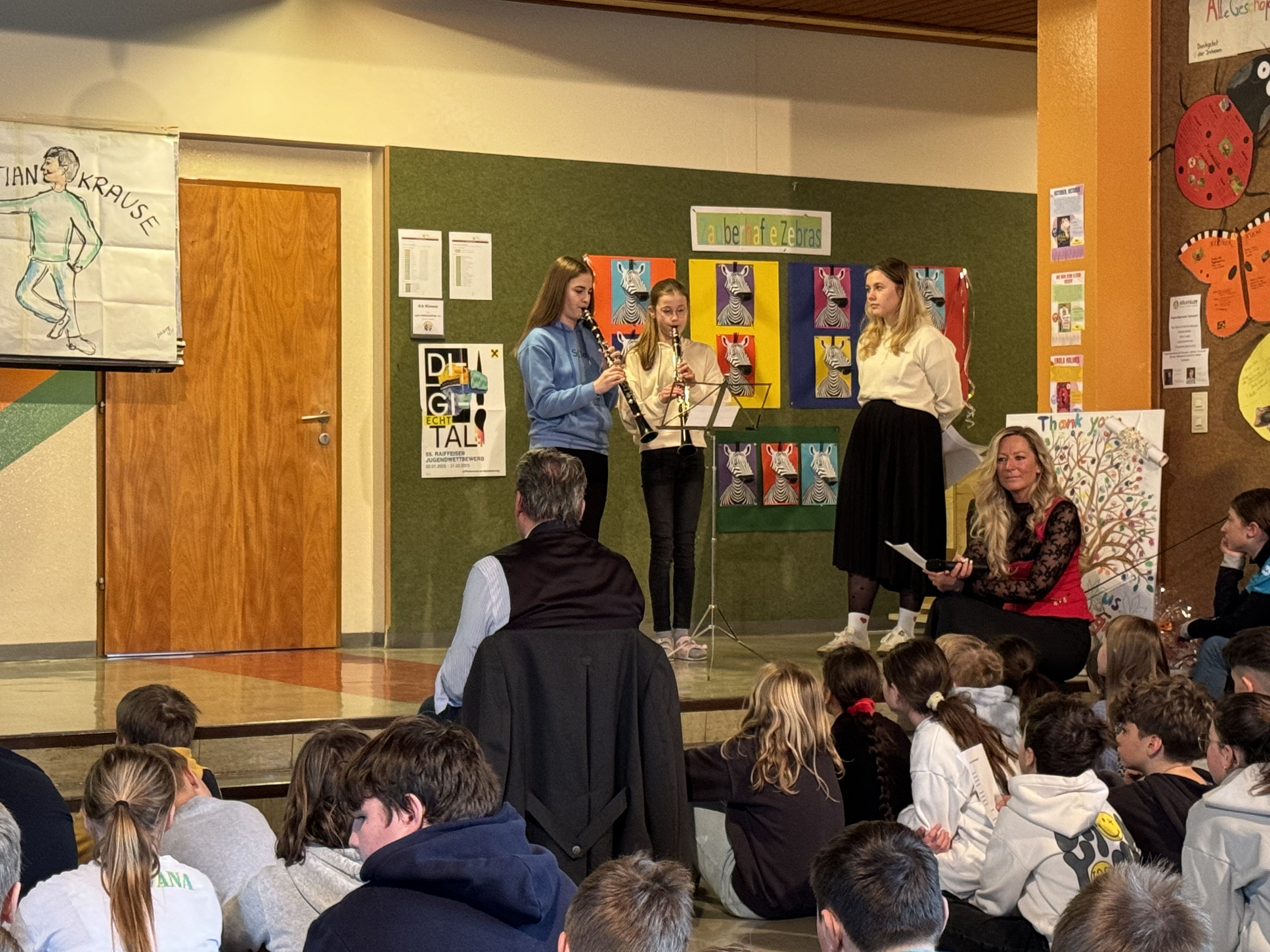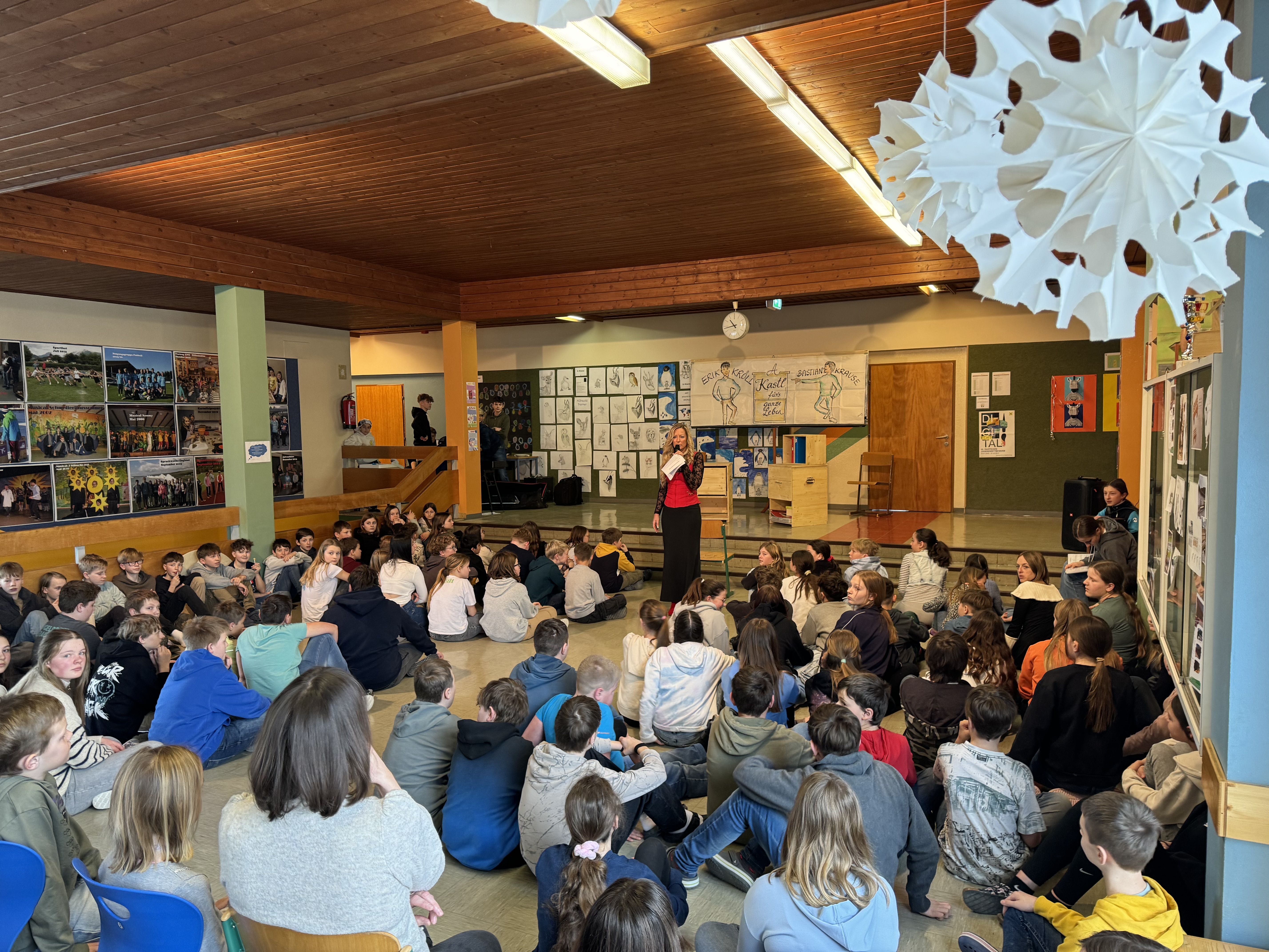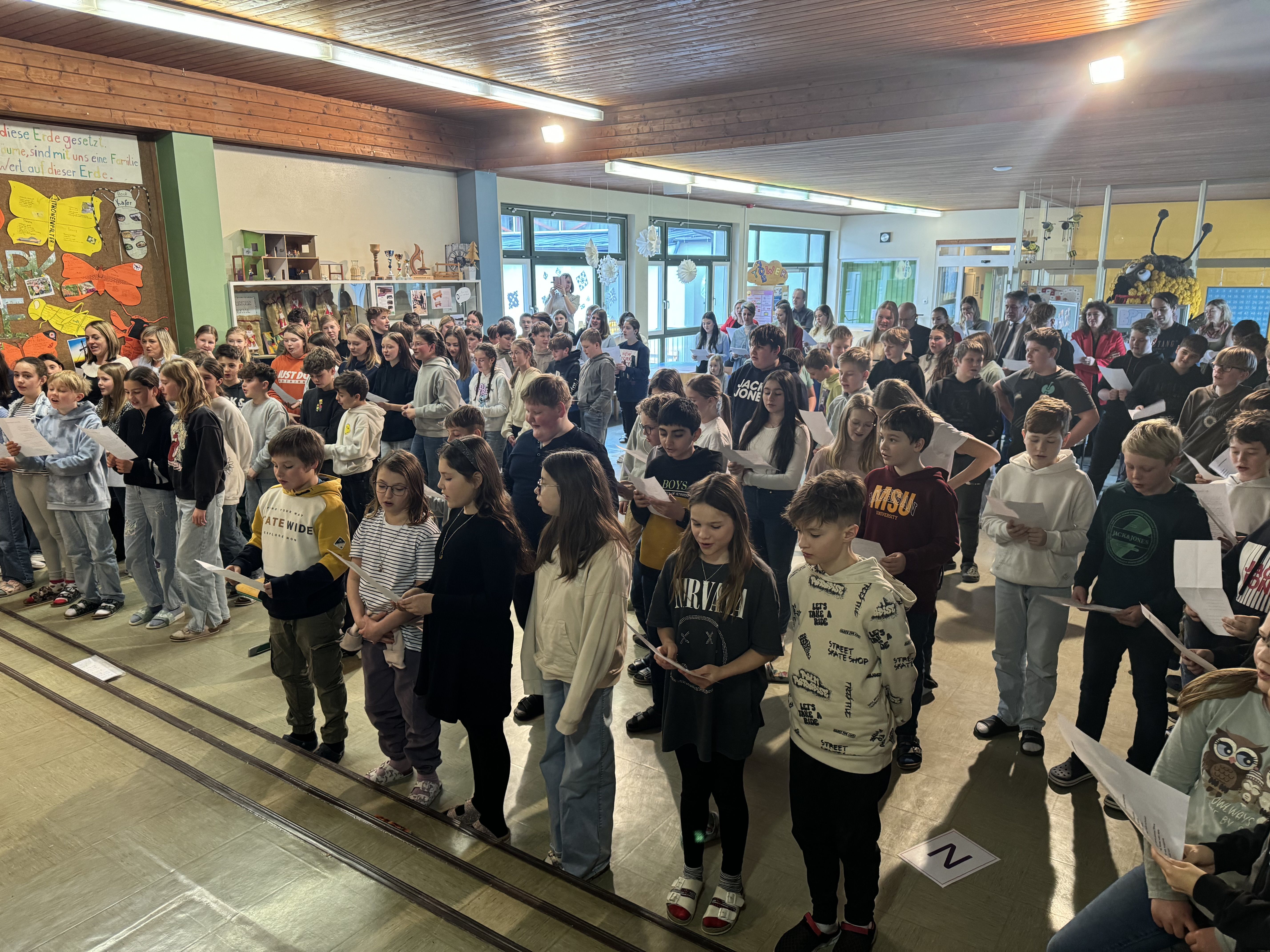 Die gesamte Schule, inklusive Bürgermeister und Pfarrer, bereitete ihm eine feierliche Verabschiedung. Mit einem Geschenk, vorgetragenen Gedichten und gemeinsamen Liedern wurde Herr Unger für seine jahrelange Arbeit an unserer Schule geehrt. Sichtlich gerührt nahm er die herzlichen Worte und Glückwünsche entgegen.