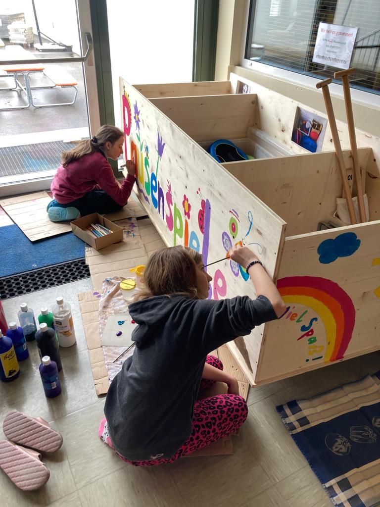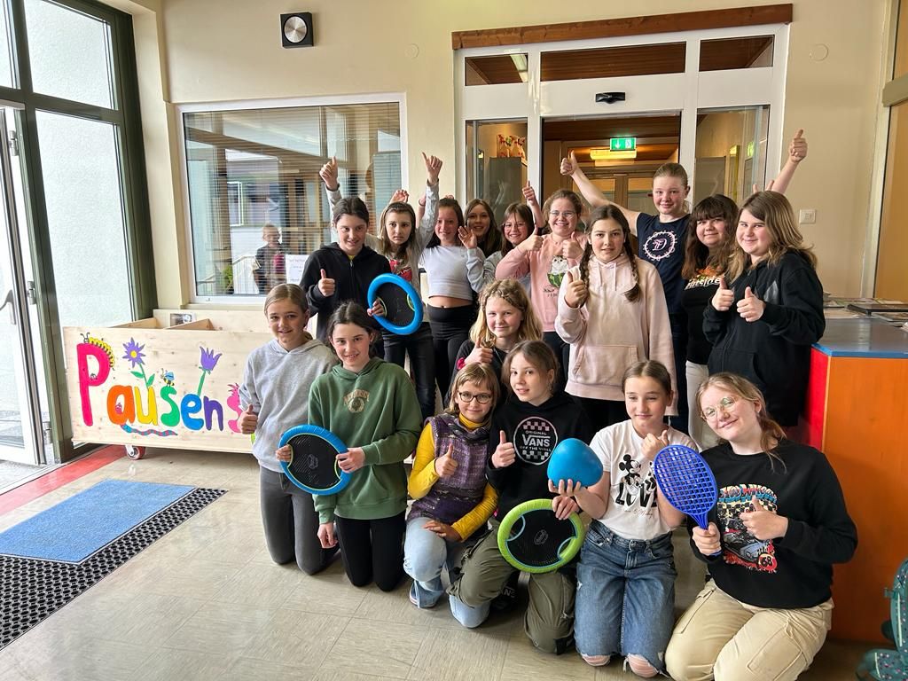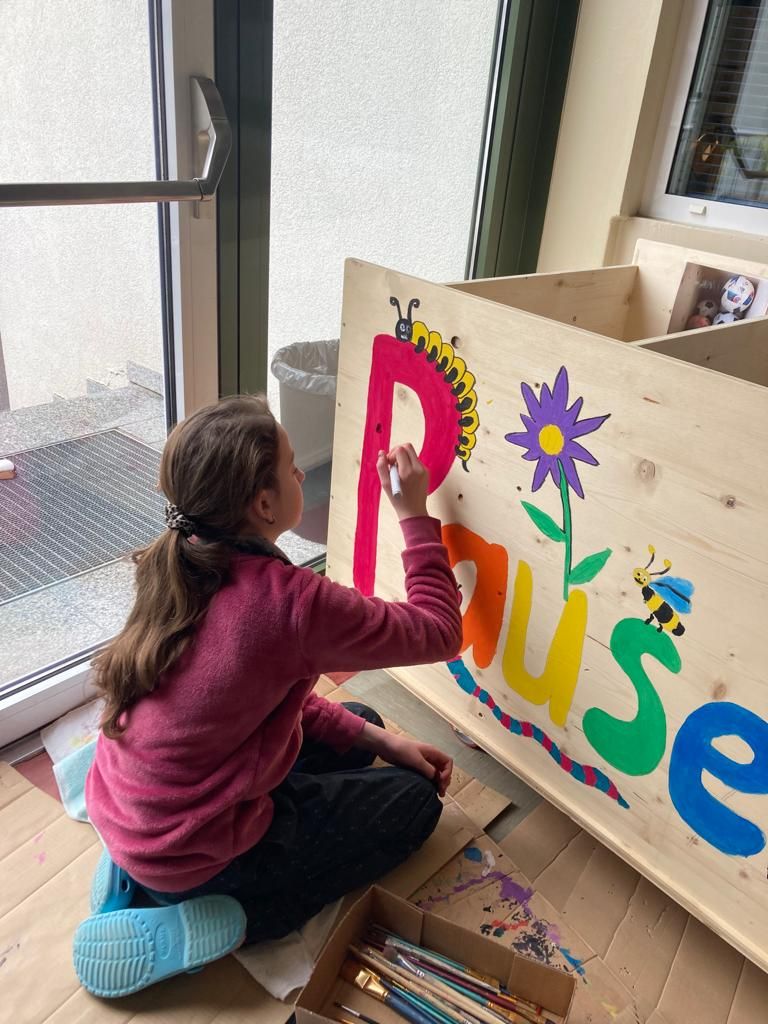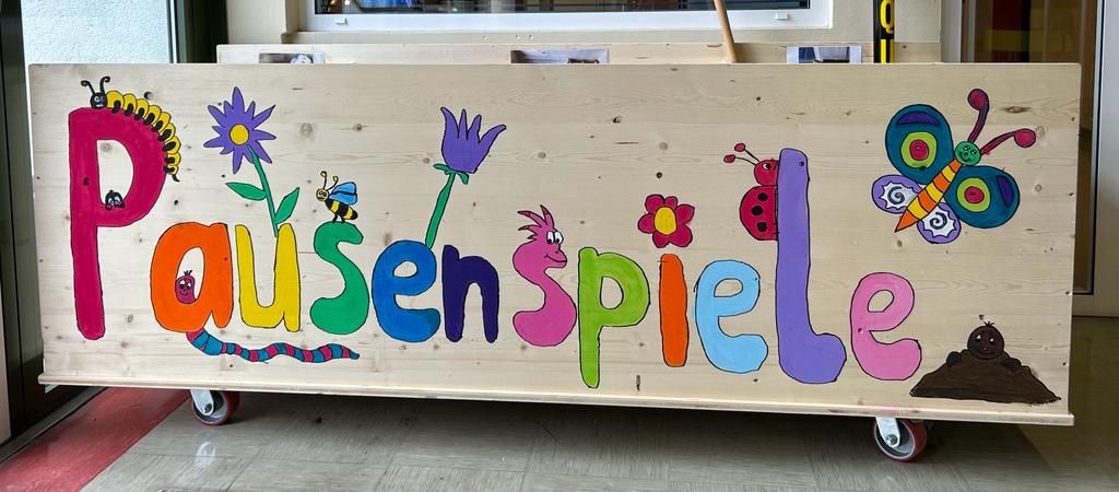 Dazu wurden neue Spiele und Sportgeräte angekauft und mit den Schülerinnen der 2. Klasse eine Pausekiste gestaltet.