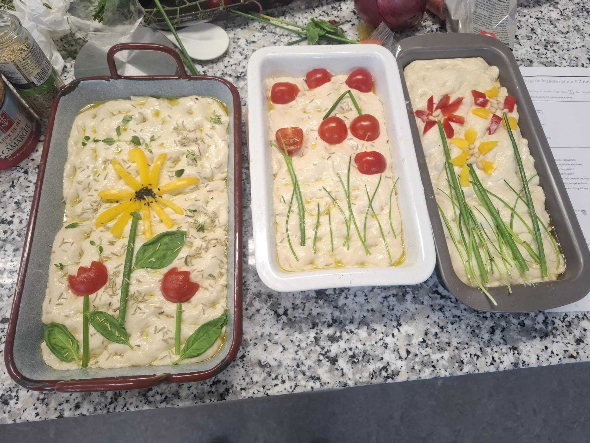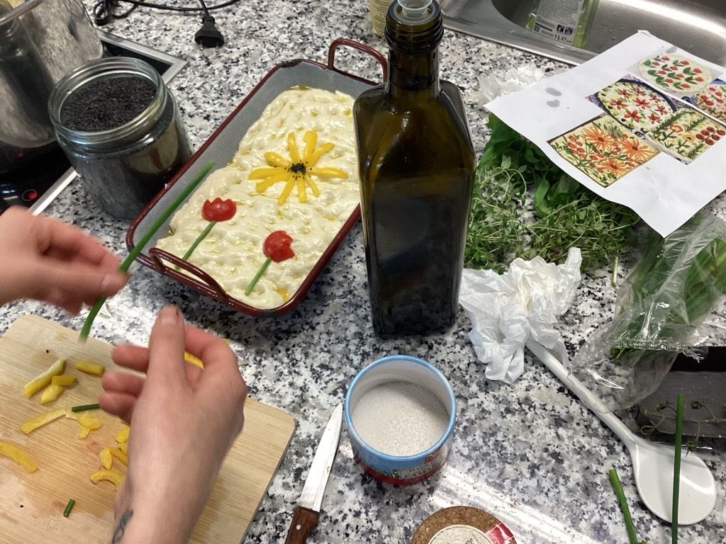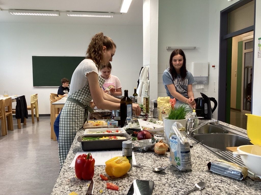 Die 2. und 3. Klasse kochte gemeinsam und bereitete kreative Gerichte zu. Besonders gelungen war die frühlingshaft gestaltete Focaccia.