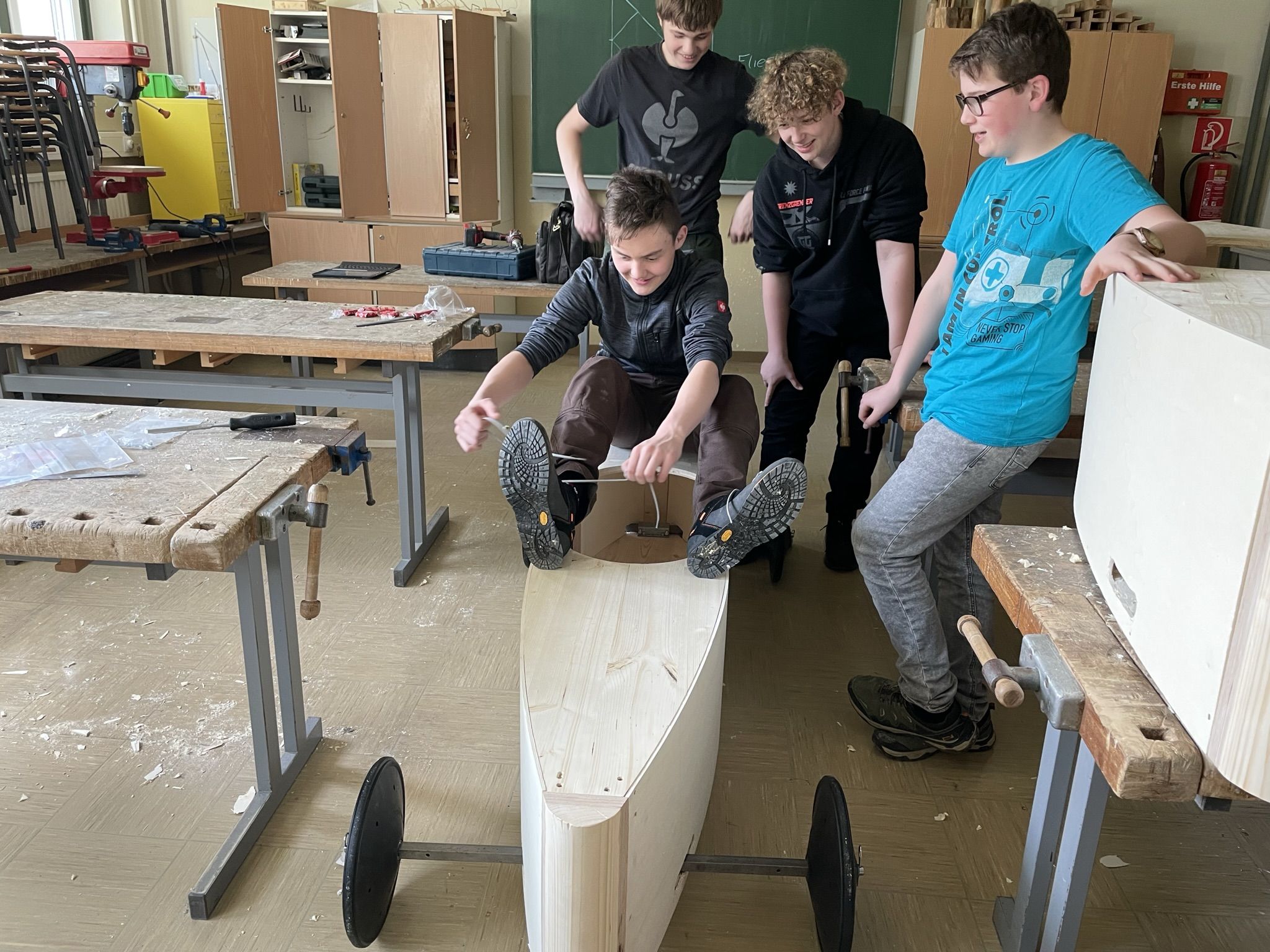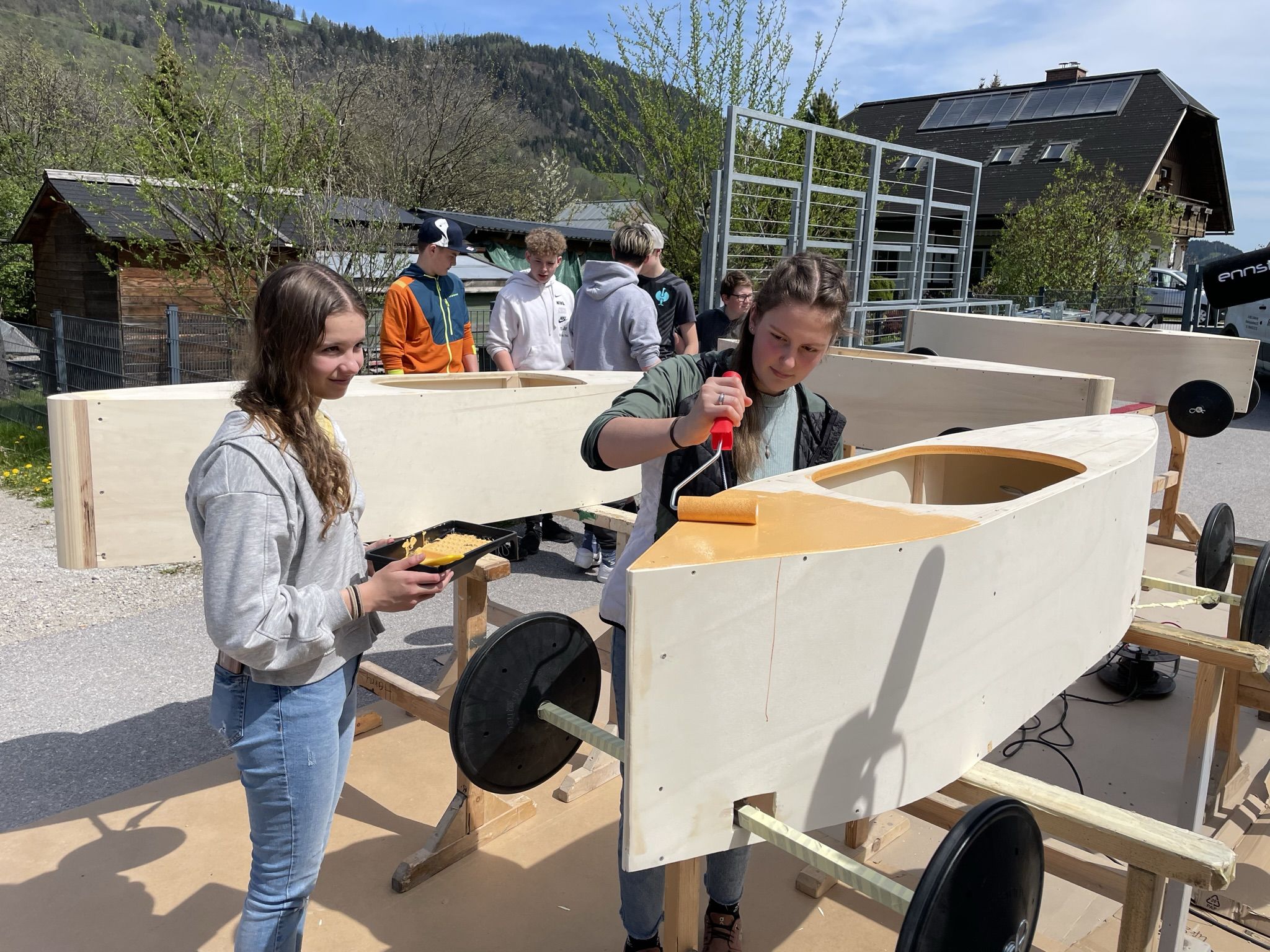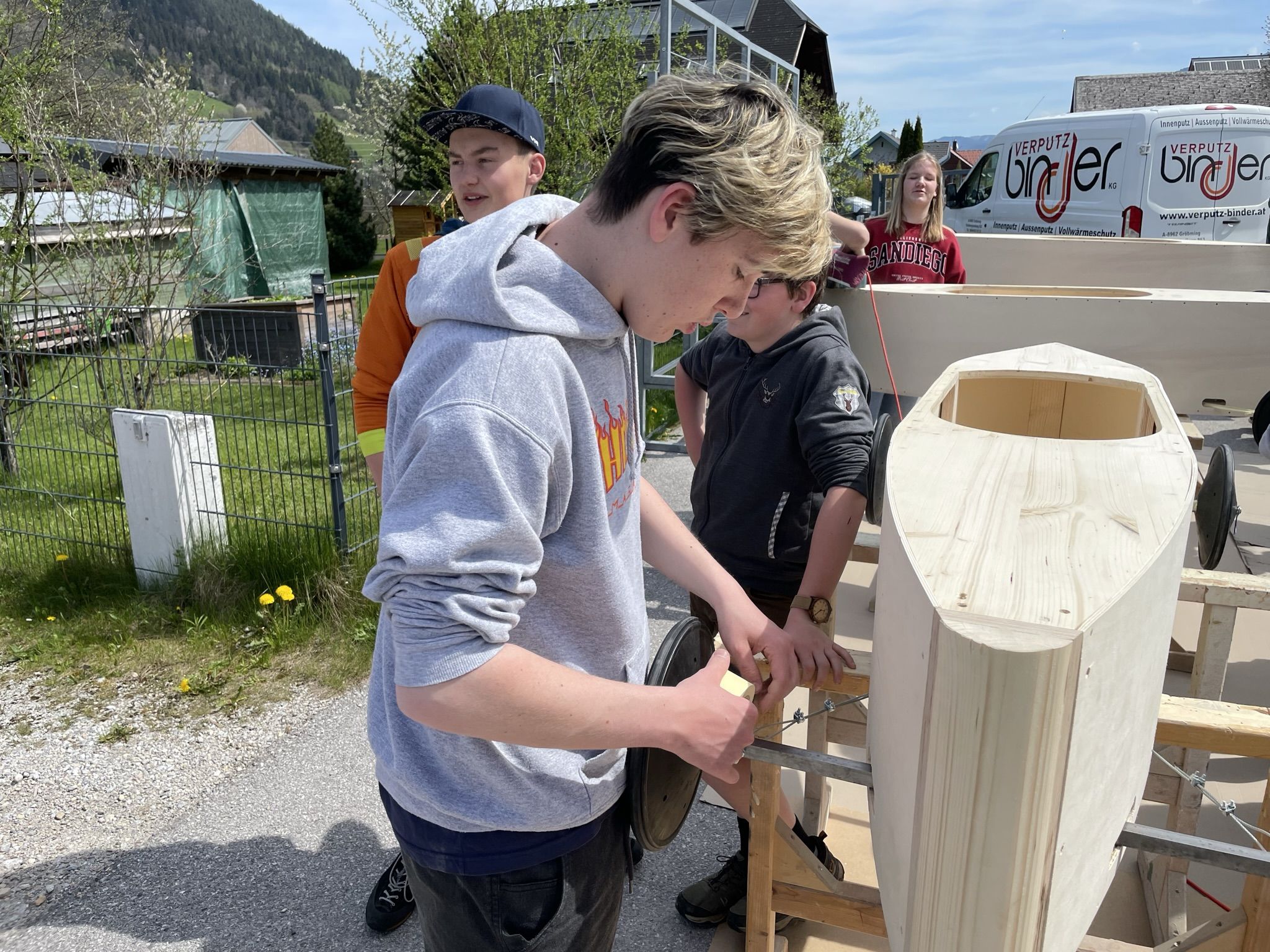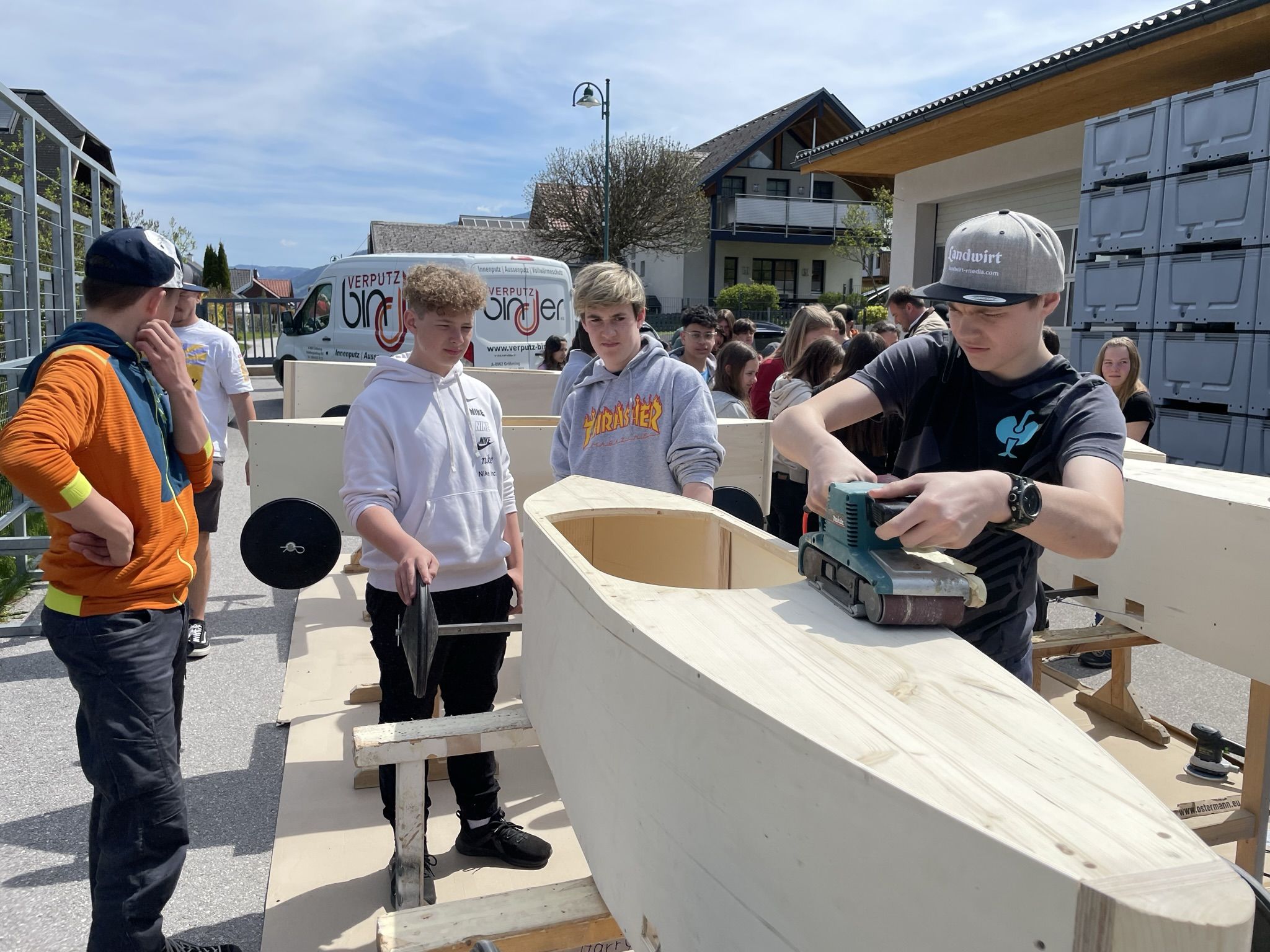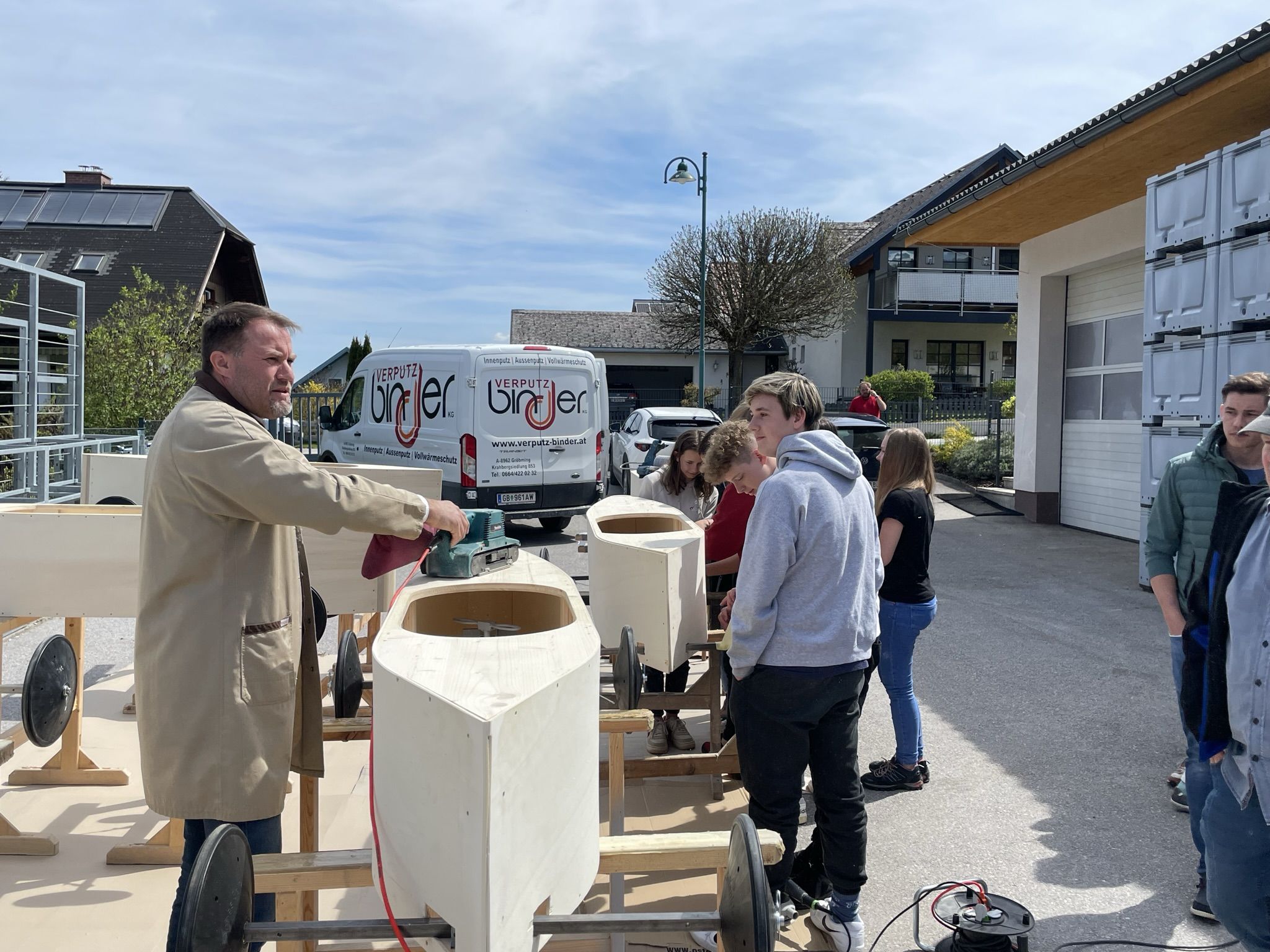 Im Unterrichtsfach technisches Design haben unsere 4. Klassen drei sogenannte Juniorseifenkisten, unter der Leitung von Herrn Fischbacher und Herrn Gabriel, für die Brauchtumsgruppe Gröbming zusammengebaut. Nach 4 Wochen anstrengender und akribischer Arbeit an den Kisten wurden wir von der Brauchtumsgruppe Gröbming in die Tischlerei Stangl nach Pruggern eigeladen, wo die Boliden abgeschliffen und lackiert wurden. Unsere Schüler und Schülerinnen durften dabei selbst Hand anlegen. Der Chef persönlich gab uns noch eine Führung durch die Tischlerei und brachte unseren Schülern und Schülerinnen das Handwerk des Tischlers näher.