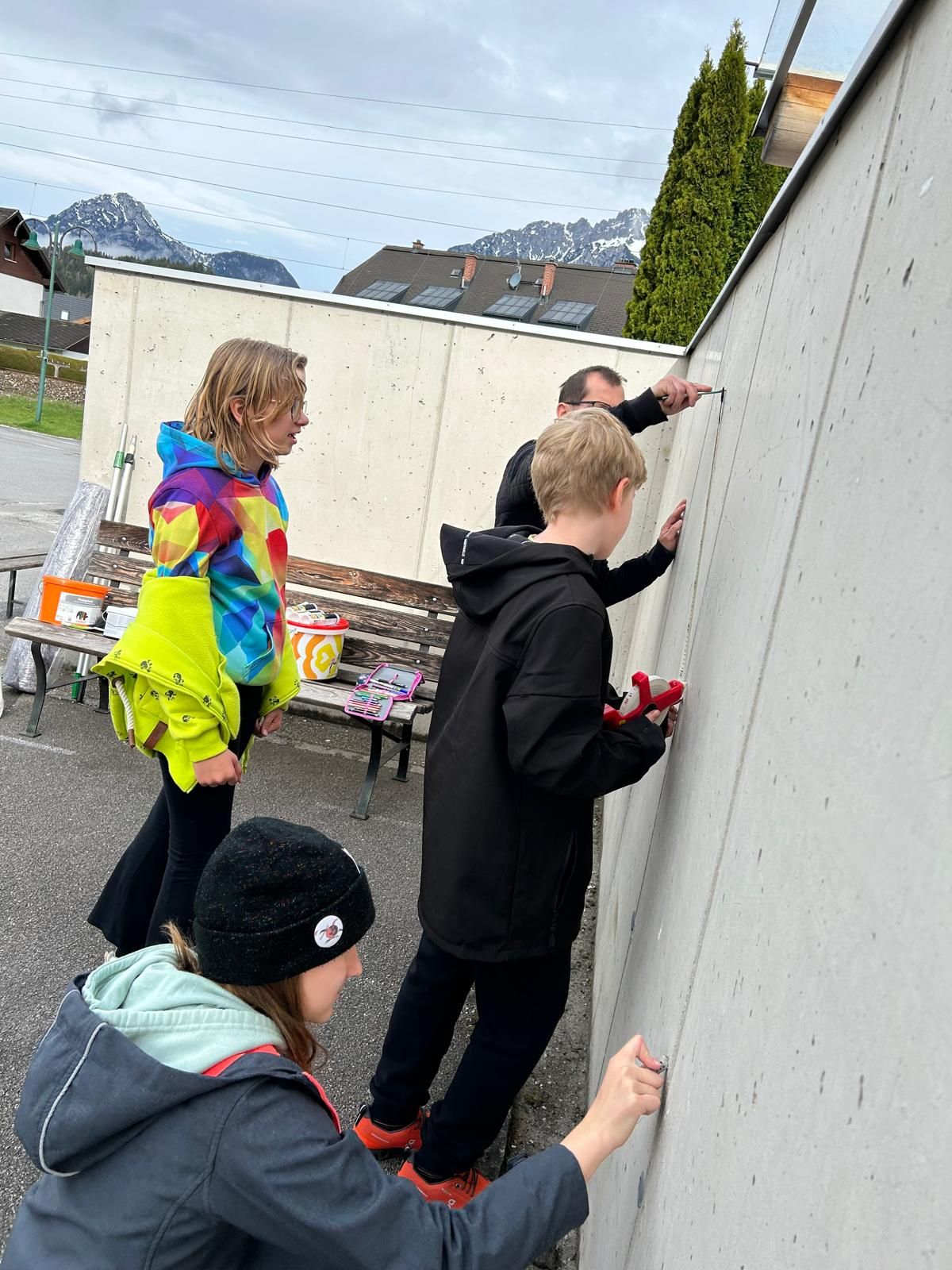 Die geplante Bushaltestelle unserer Schule soll nicht nur ein Ort des Wartens sein, sondern auch ein Kunstwerk, das die Gemeinschaft repräsentiert. Aus diesem Grund haben sich Schülerinnen und Schüler der 3. und 4. Klassen gemeinsam dazu entschlossen, die Wände der Bushaltestelle mit Leben zu füllen, noch bevor diese überhaupt errichtet wird. Im Mittelpunkt dieser Gestaltung steht unser Schullogo, das von den Schülerinnen und Schülern detailgetreu gemalt wurde und einen bedeutenden Platz an den Wänden der Bushaltestelle einnehmen wird. Zusätzlich zu unserem Logo schmücken auch Farbtropfen die Wände, welche in verschiedenen Farben und Größen das kreative Potential unserer Schülerinnen und Schüler repräsentieren sollen.