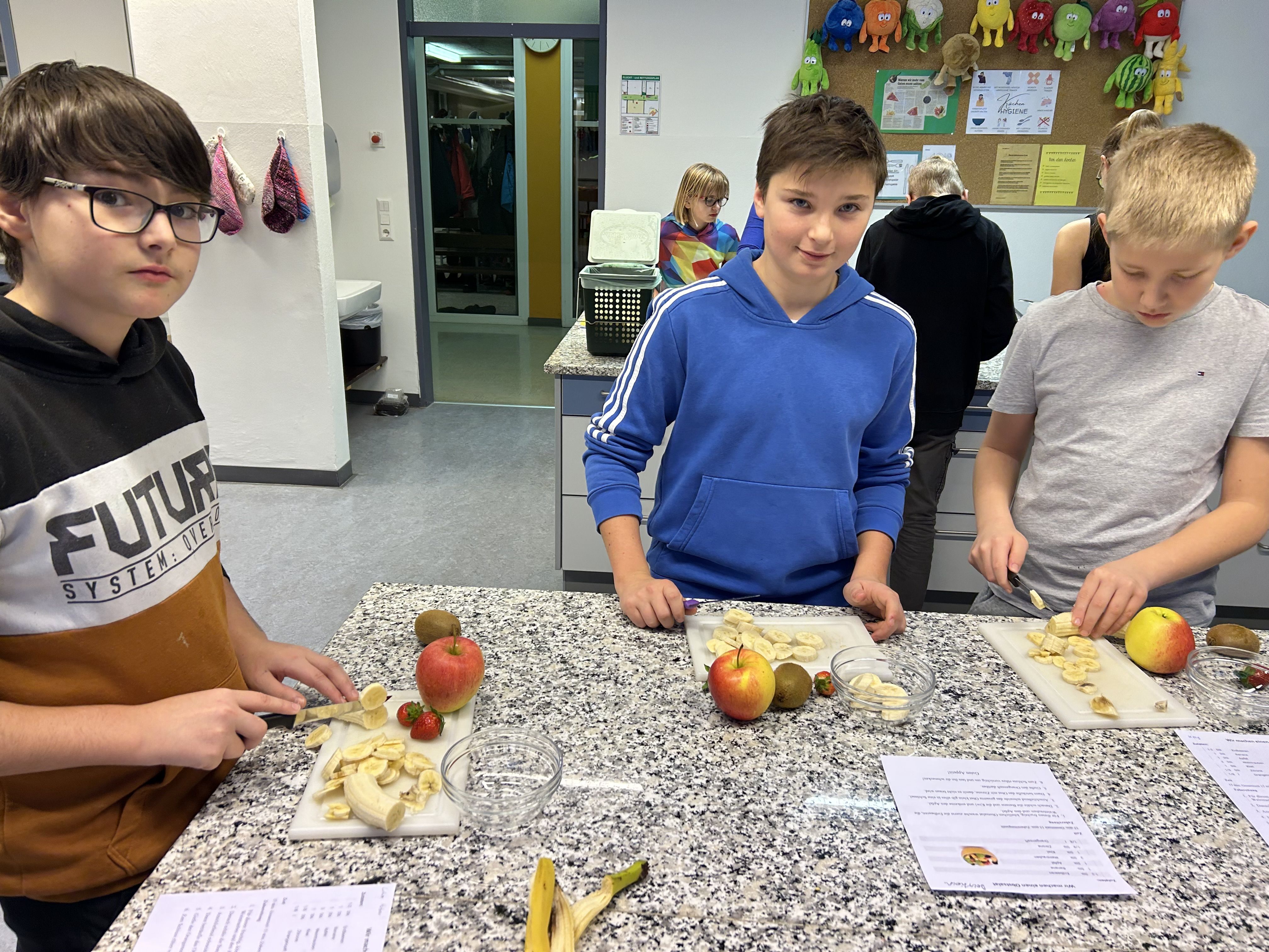 Nachdem das Thema „Vorgangsbeschreibung“ abgeschlossen wurde, bereiteten Schülerinnen und Schüler der 2. Klasse einen Obstsalat zu.
