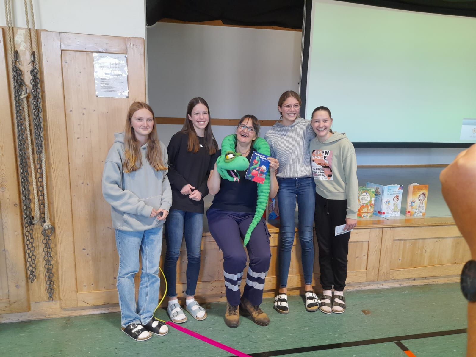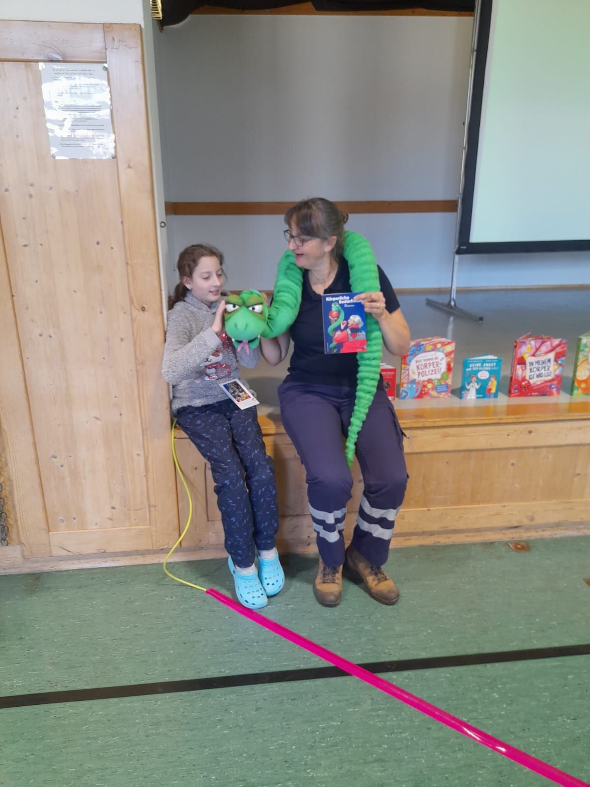 Die Künstlerin las dazu nicht nur aus ihren Büchern, sondern übte sich mit einer Handpuppe – einer übergroßen Äskulapnatter – auch noch als Bauchrednerin. Mithilfe dieses plüschigen Helfers ist es Frau Dr. Mottl-Link sehr gut gelungen, ein ernsthaftes Gesundheitsthema auf witzige und kindgerechte Art zu vermitteln.