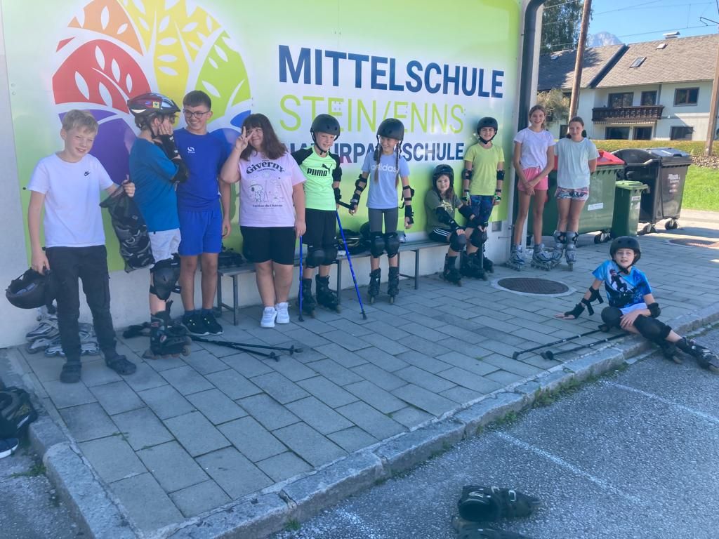Und wie machen wir das mit dem Sport? Wir versuchen im Bewegungsteil wirklich alle Kinder zu erreichen und eine Begeisterung für körperliche Bewegung zu erzielen. Deswegen gehen wir auf zahlreiche Wünsche unserer SchülerInnen ein, neue oder bekannte Sportarten auszuprobieren. In einer Einheit setzten wir daher bei Sonnenschein auf Inline-Skates.