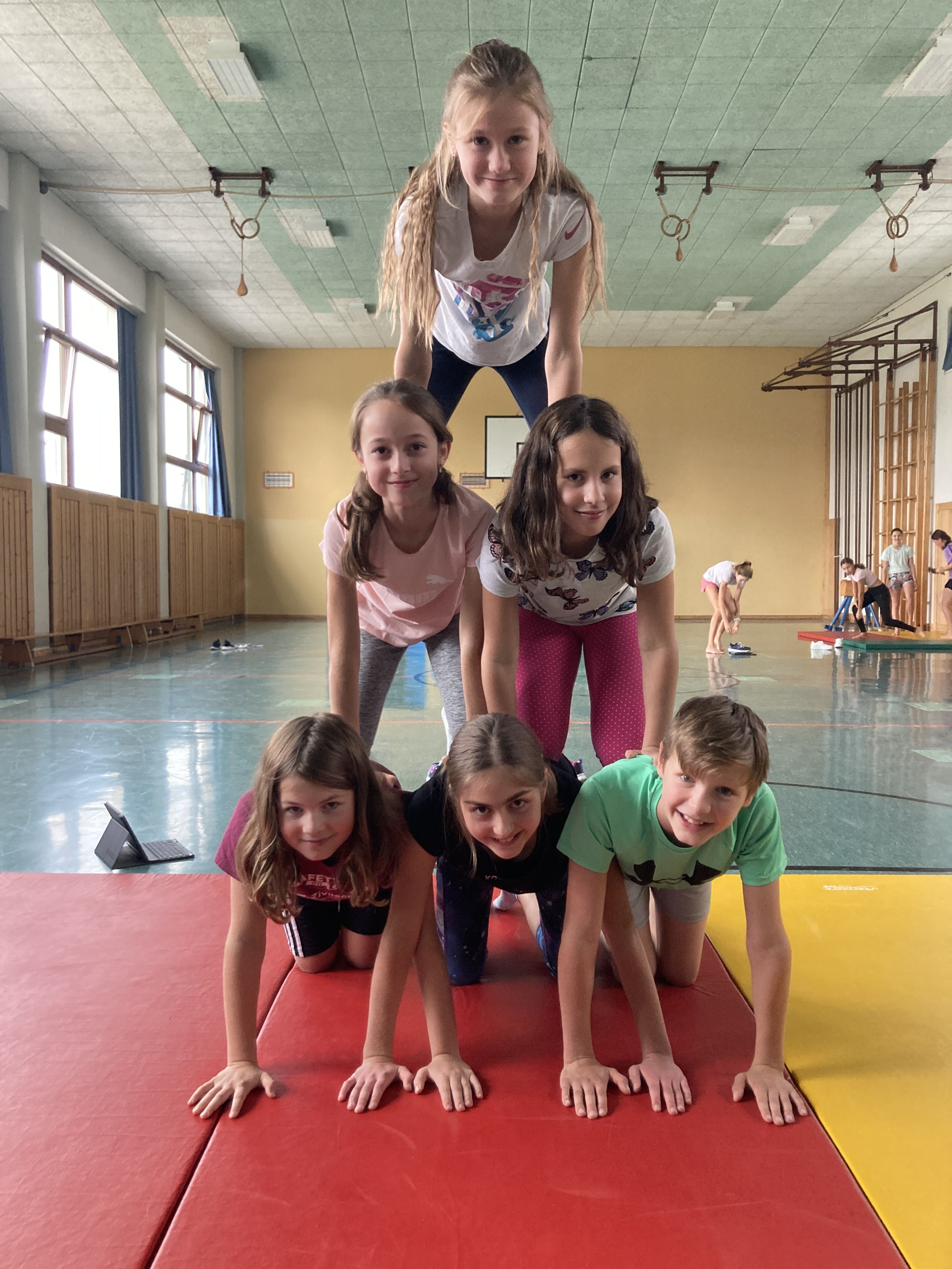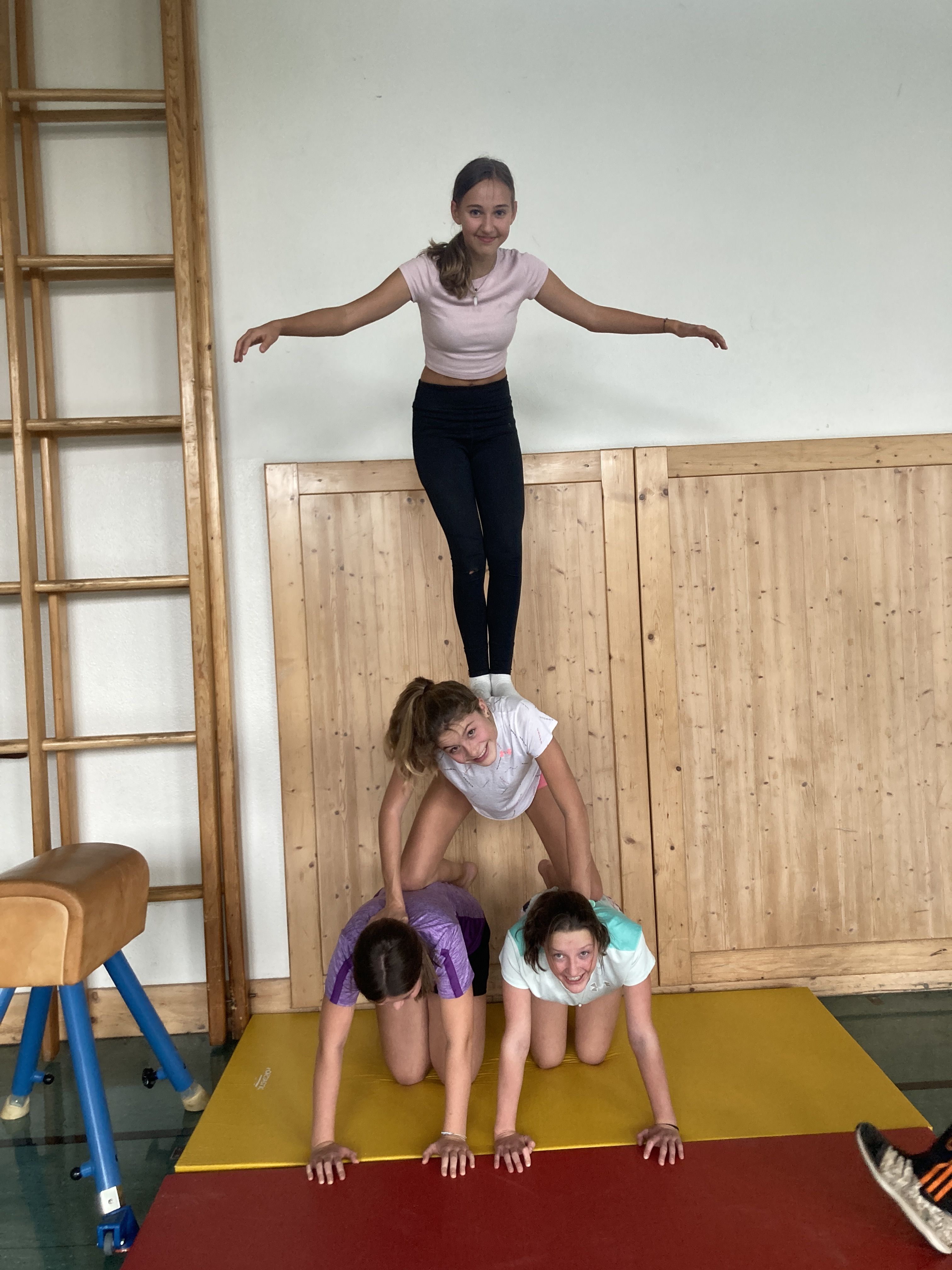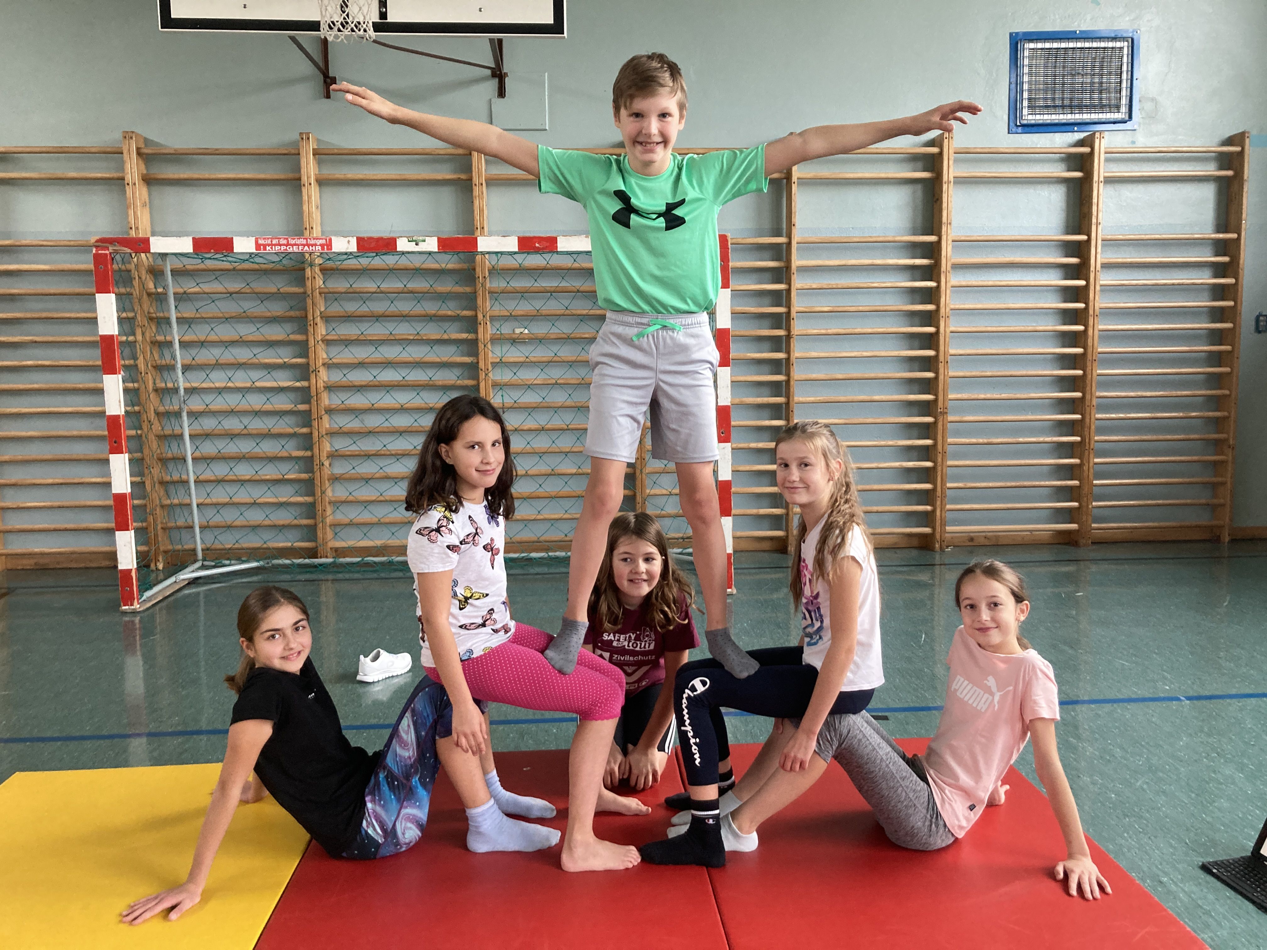 Da in diesem Freifach alle Jahrgänge vertreten sind, biete es sich wunderbar an sportliche Übungen zur Stärkung der Teamarbeit durchzuführen. Die SchülerInnen wurde vor die Herausforderung gestellt in 2er-, 3er-, 4er und 5er-Gruppen menschliche Pyramiden zu errichten, wodurch nicht nur ihre körperliche Koordination, sondern auch ihre Teamfähigkeit gefördert wird.