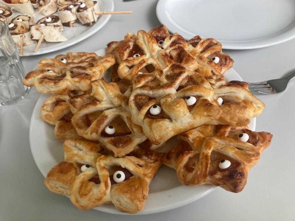 Vor allem gesunde Ernährung stoßt bei den meisten Kindern und Jugendlichen jedoch auf Widerwillen.  Es hat meistens etwas mit Verboten und Verzicht zu tun. Wir versuchen einen anderen Zugang zu wählen, wie z.B. mit grusligen Köstlichkeiten zu Halloween. Von Blätterteig Mumien- und Spinnen bis hin zu gespenstigen Mitbringsel – den SchülerInnen wurde ein schaurig, aber dennoch gesundes Menü geboten.