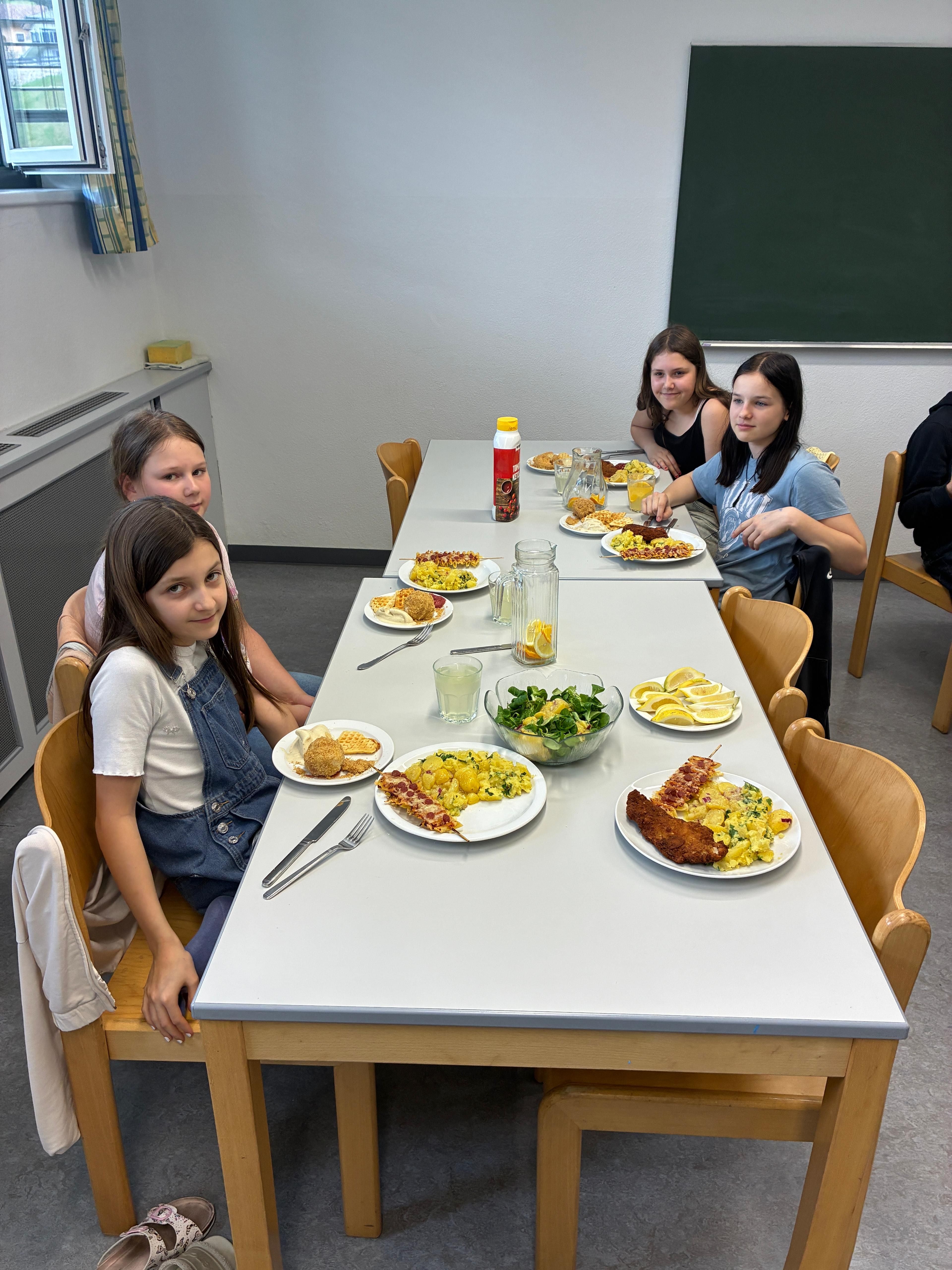 Die 2. und 3. Klasse kochte gemeinsam und bereitete kreative Gerichte zu. Besonders gelungen war die frühlingshaft gestaltete Focaccia.