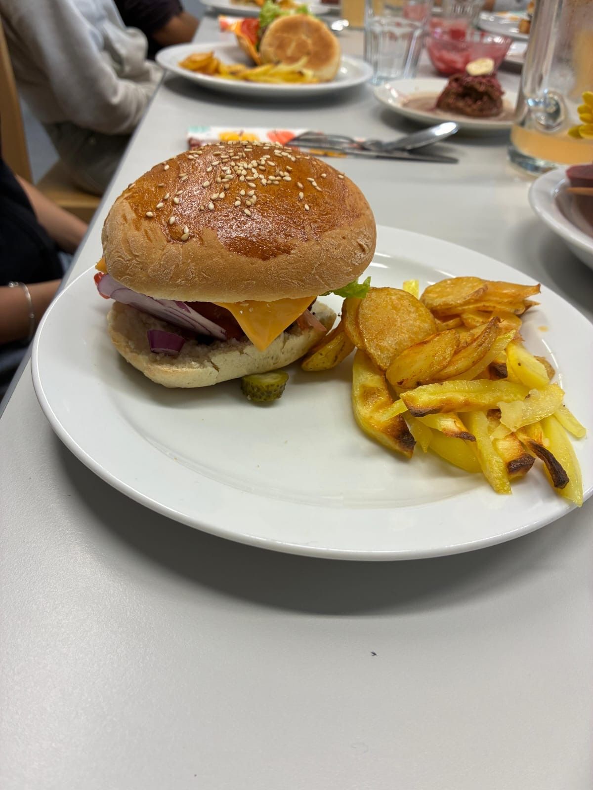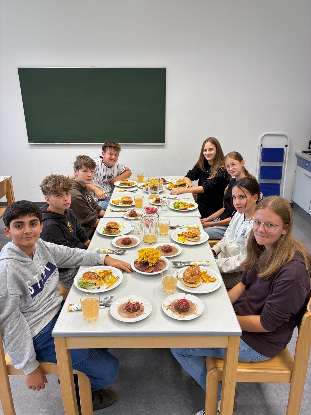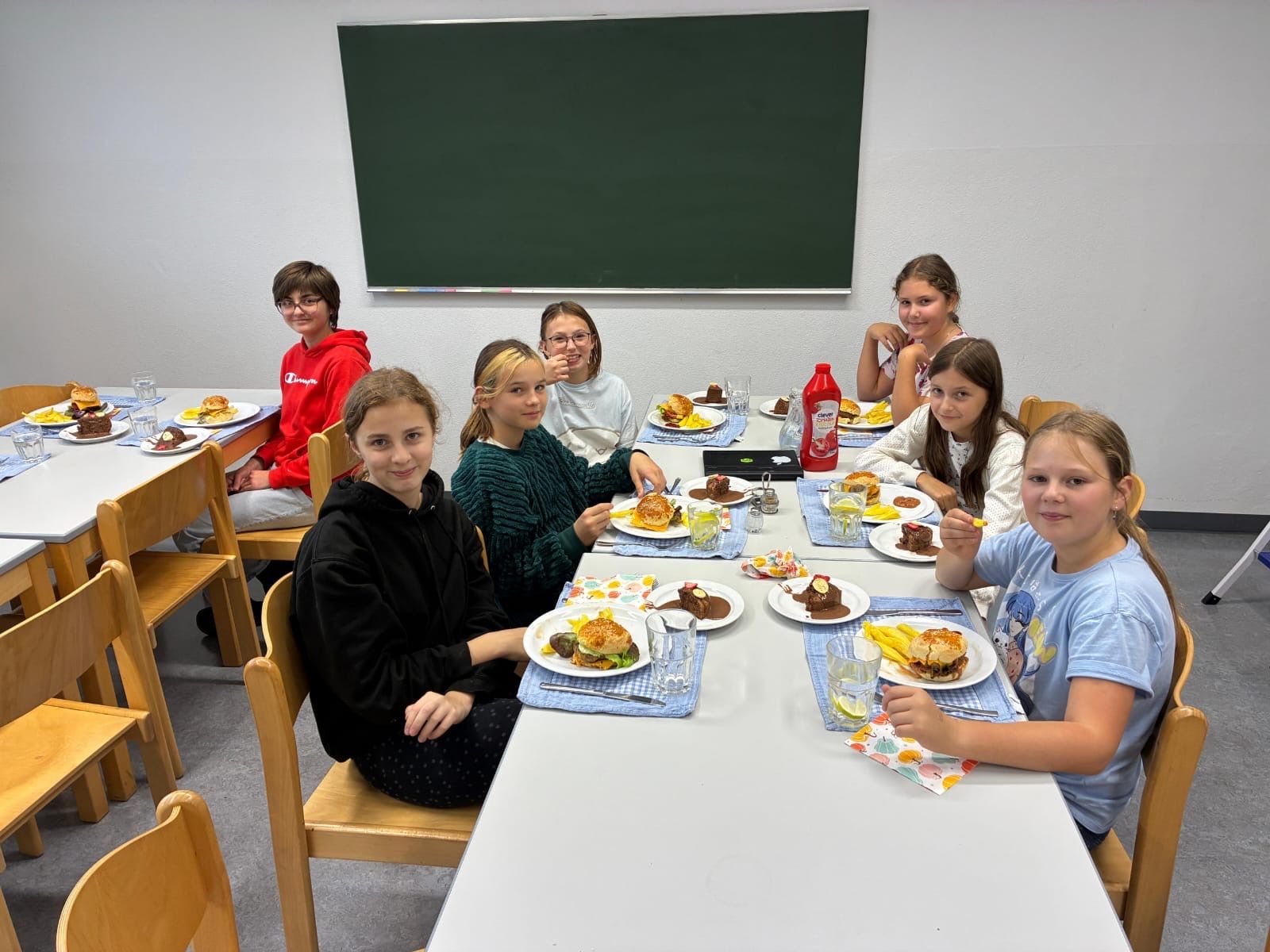 Im Freifach "Bewegung und Ernährung" haben wir leckere Burger mit Pommes selbst gemacht – vom Brötchen über das Patty bis zur Sauce! Zum Dessert gab es einen saftigen brasilianischen Schokokuchen mit Schokosauce.