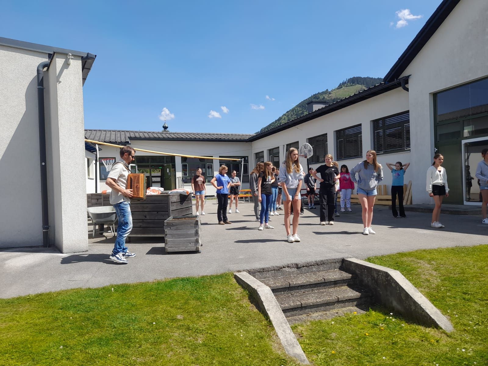 Was wäre ein Maibaumaufstellen ohne Tanz um den Maibaum? Richtig, kein Maibaumaufstellen. Deshalb gaben die Mädchen der dritten und vierten Klassen auch einen im Turnunterricht mit Frau Gerharter einstudierten Tanz zum Besten. Musikalisch begleitet wurden sie dabei von Herrn Fischbacher mit seiner Steirischen Harmonika, der sein Instrument schließlich im fliegenden Wechsel an Lukas Huber aus der dritten Klasse übergab, der weiterspielte.