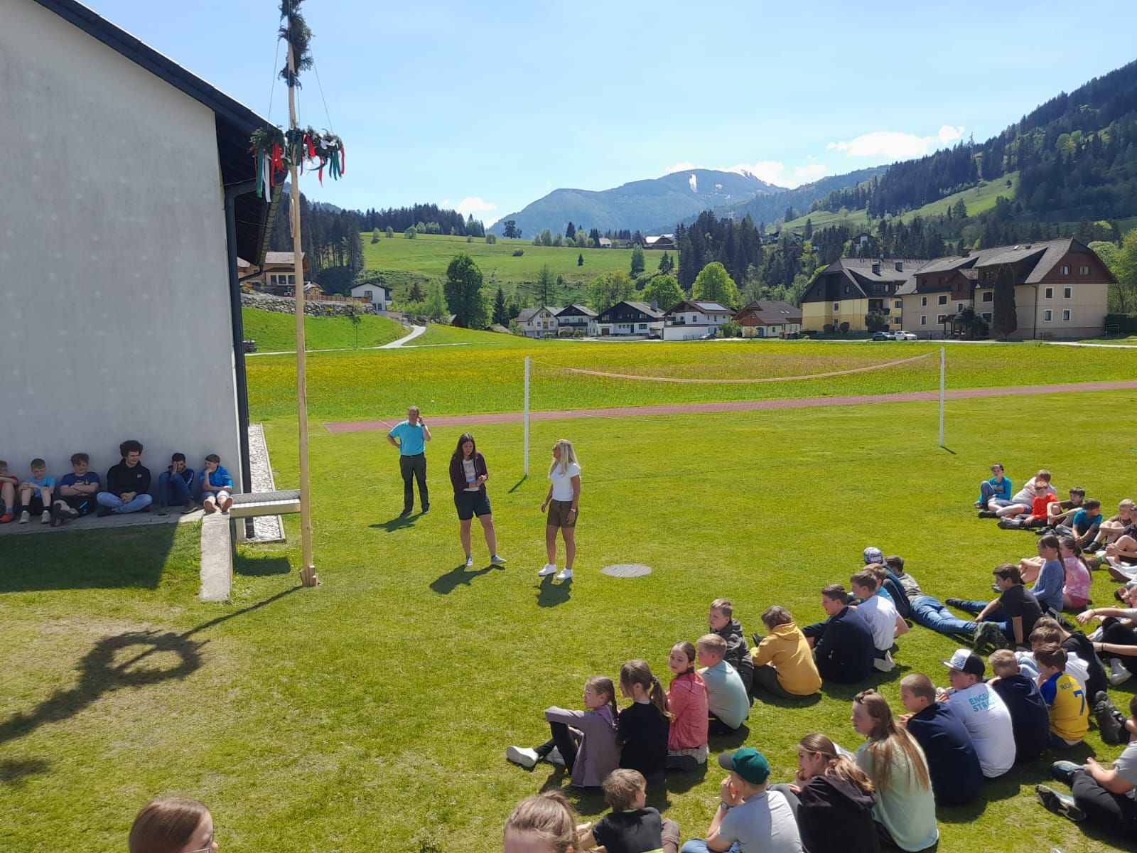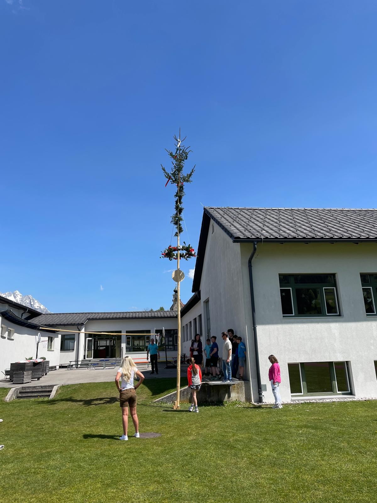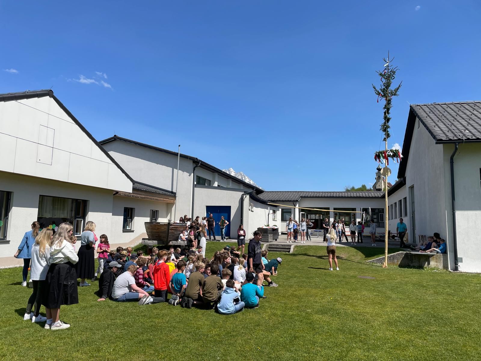 Um den Frühling willkommen zu heißen, versammelten sich am 30. April alle Schüler und Schülerinnen sowie das gesamte Lehrpersonal am Sportplatz, um das Aufstellen des Baums zu zelebrieren. Die Schüler der Brauchtumsgruppe von Frau Gerharter hatten die von Lena Daums Familie dankenswerterweise zur Verfügung gestellte Fichte im Vorfeld in einen prachtvollen traditionellen Maibaum verwandelt.