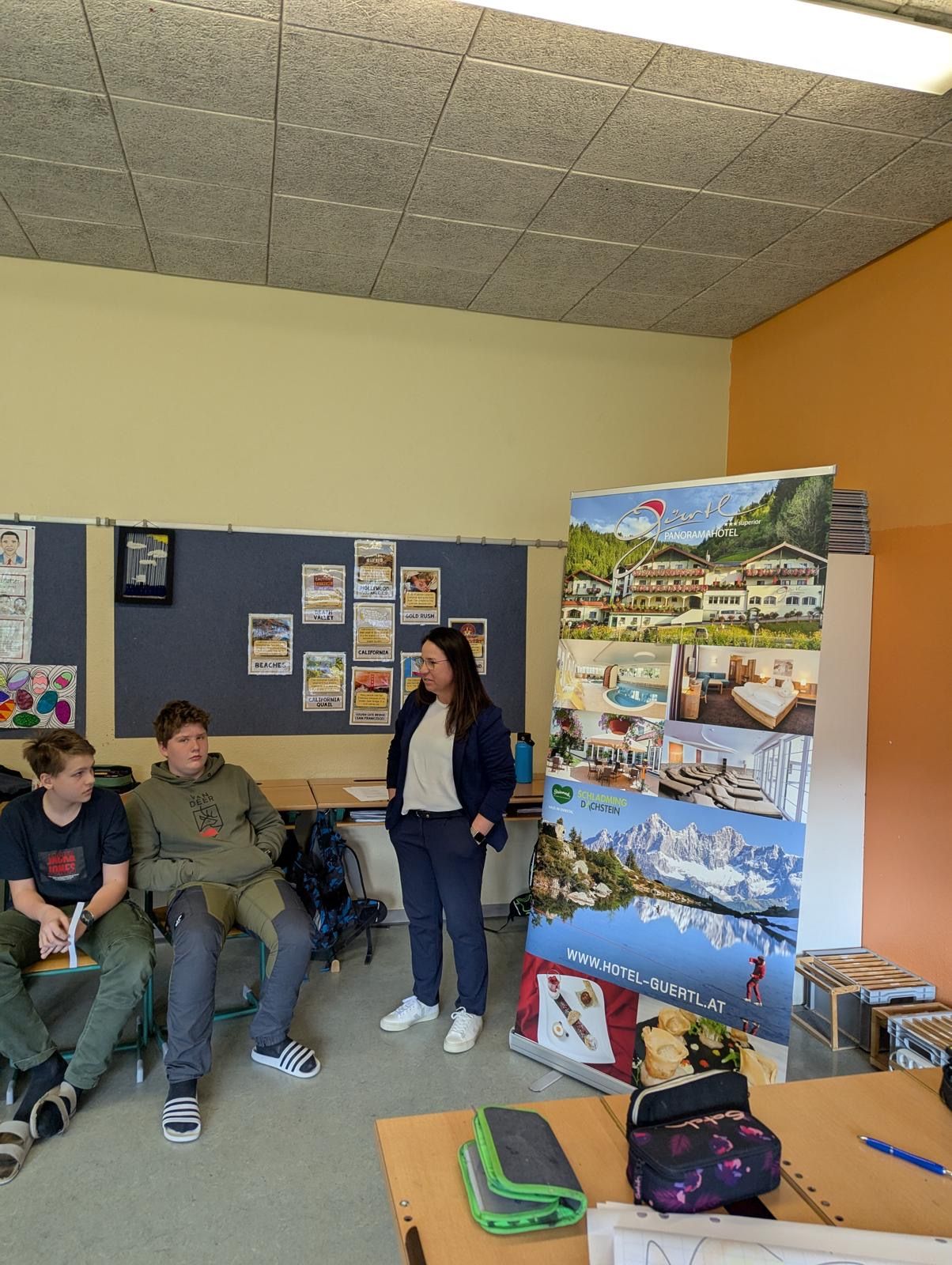 Unter der fachkundigen Leitung von Frau Mag. Peer-Kassar wurden dabei unseren Schülerinnen und Schülern die vielfältigen Ausbildungs- und Berufsmöglichkeiten in der Tourismusbranche nähergebracht. In der letzten Einheit besuchte uns Frau Gürtl, die Direktorin des Panoramahotels Gürtl in Haus im Ennstal. Sie berichtete uns aus der Praxis und beantwortete geduldig alle auftauchenden Fragen.