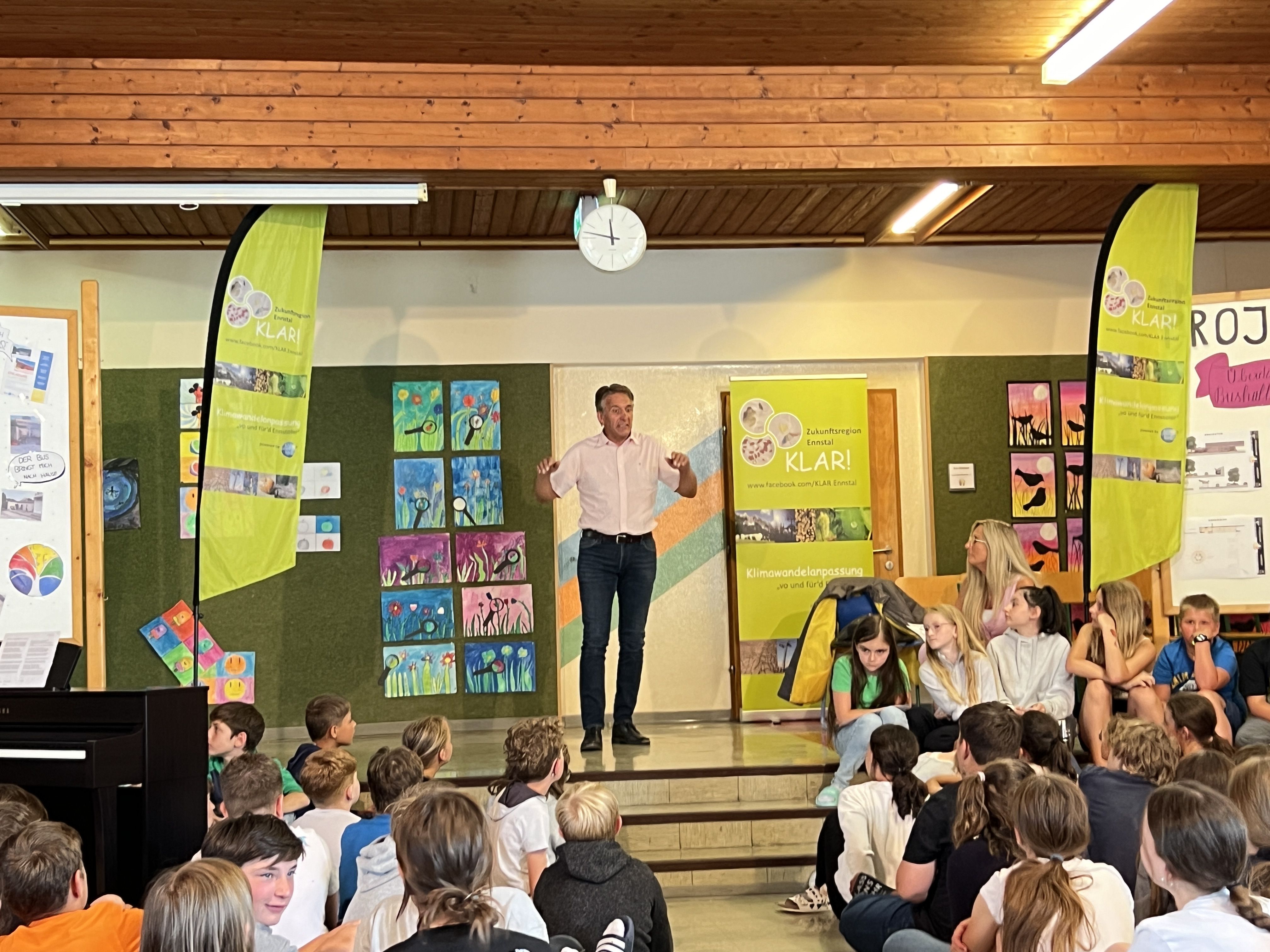 Die Eröffnungsfeier fand ab 11:30 Uhr in der Pausenhalle statt. Nach der Begrüßung durch Direktorin Patrizia Mattlschweiger, einem Schuhplattler von Schülerinnen und Schülern der ersten Klasse und einer Rede von Bürgermeister Schwab wurde es mit dem Chor und Sepp Schnedl musikalisch. Die Liedauswahl? Mit „Der Bus hat keine Bremsen“ äußerst passend.